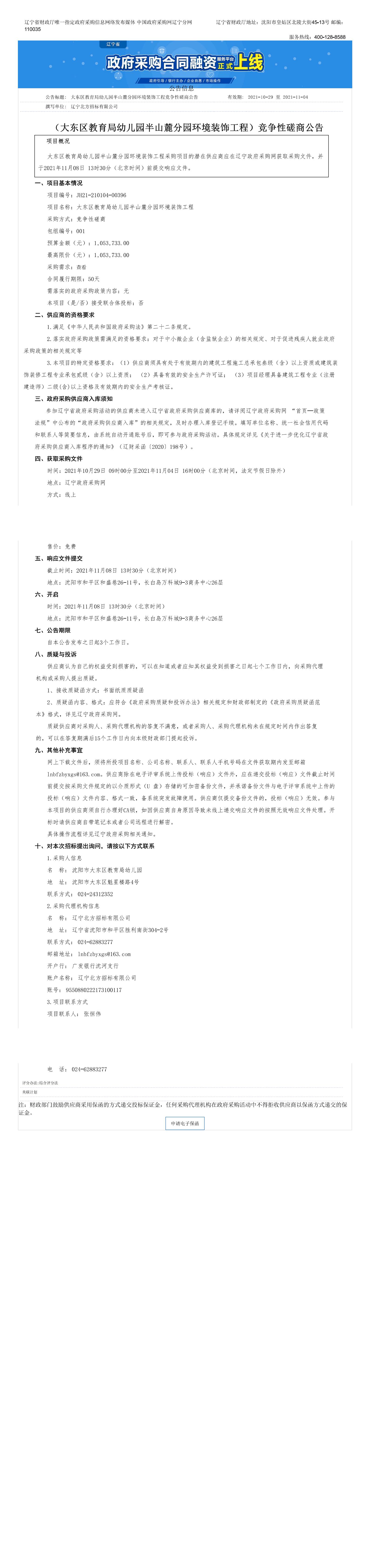 大東區(qū)教育局幼兒園半山麓分園環(huán)境裝飾工程采購項(xiàng)目的潛在供應(yīng)商應(yīng)在遼寧政府采購網(wǎng)獲取采購文件,并于2021年11月08日 13時(shí)30分(北京時(shí)間)前提交響應(yīng)文件。